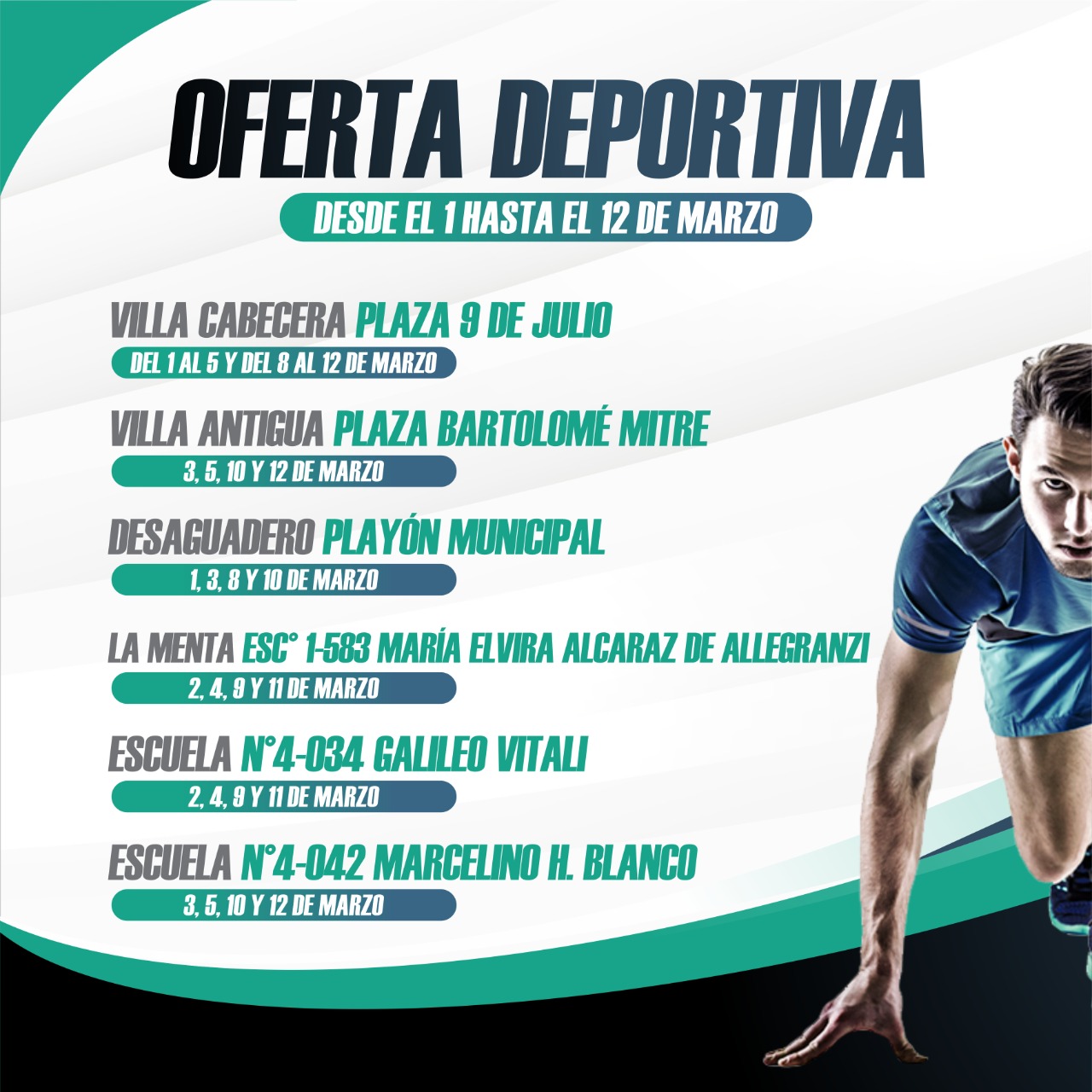 - Desaguadero, PLAYÓN MUNICIPAL - Lunes y Miércoles (1,3,8 y 10 de marzo) de 19 a 21 hs.