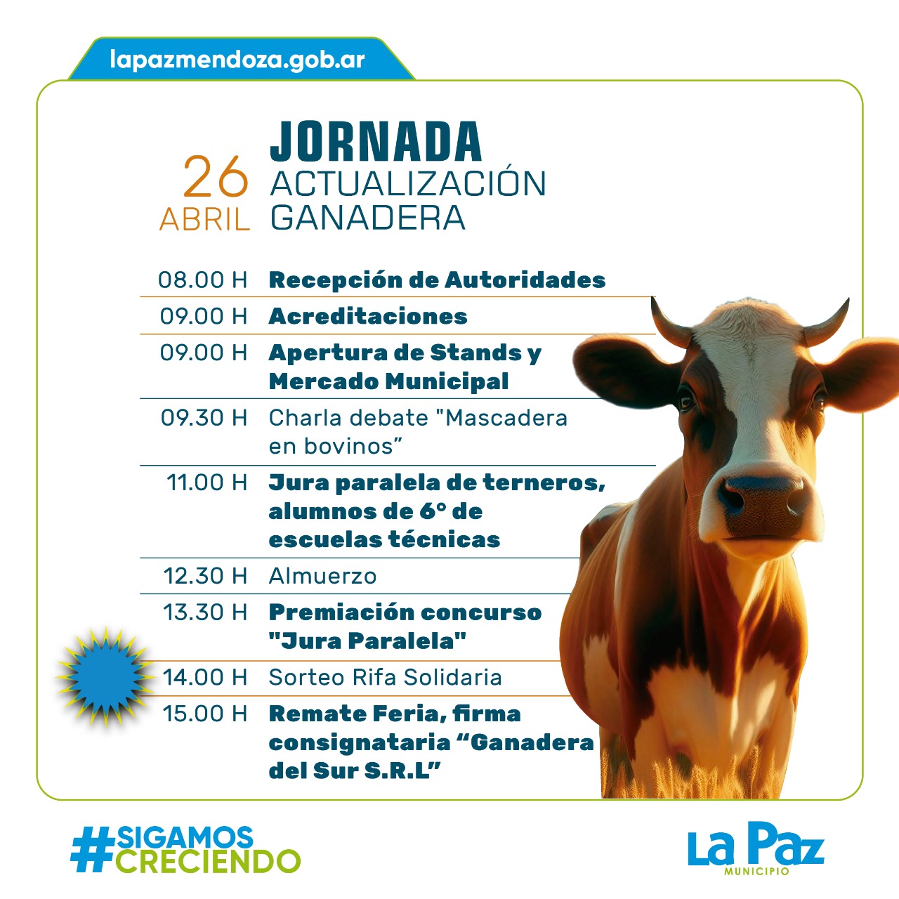 El Municipio invita a estudiantes, profesionales, productores y público en general a participar de la Feria Ganadera 2025, que se llevará a cabo el jueves 25 de abril en el Predio Ferial Ganadero, con una agenda pensada para fortalecer el trabajo ganadero, capacitar a productores y promover el aprendizaje técnico en el ámbito rural.
